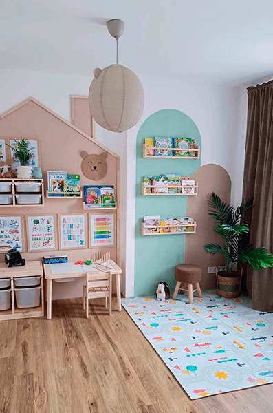 Nesta inspiração do Pinterest, foram criados dois espaços: um para desenhar e outro para leitura, ambos delimitados com cores diferentes nas paredes.